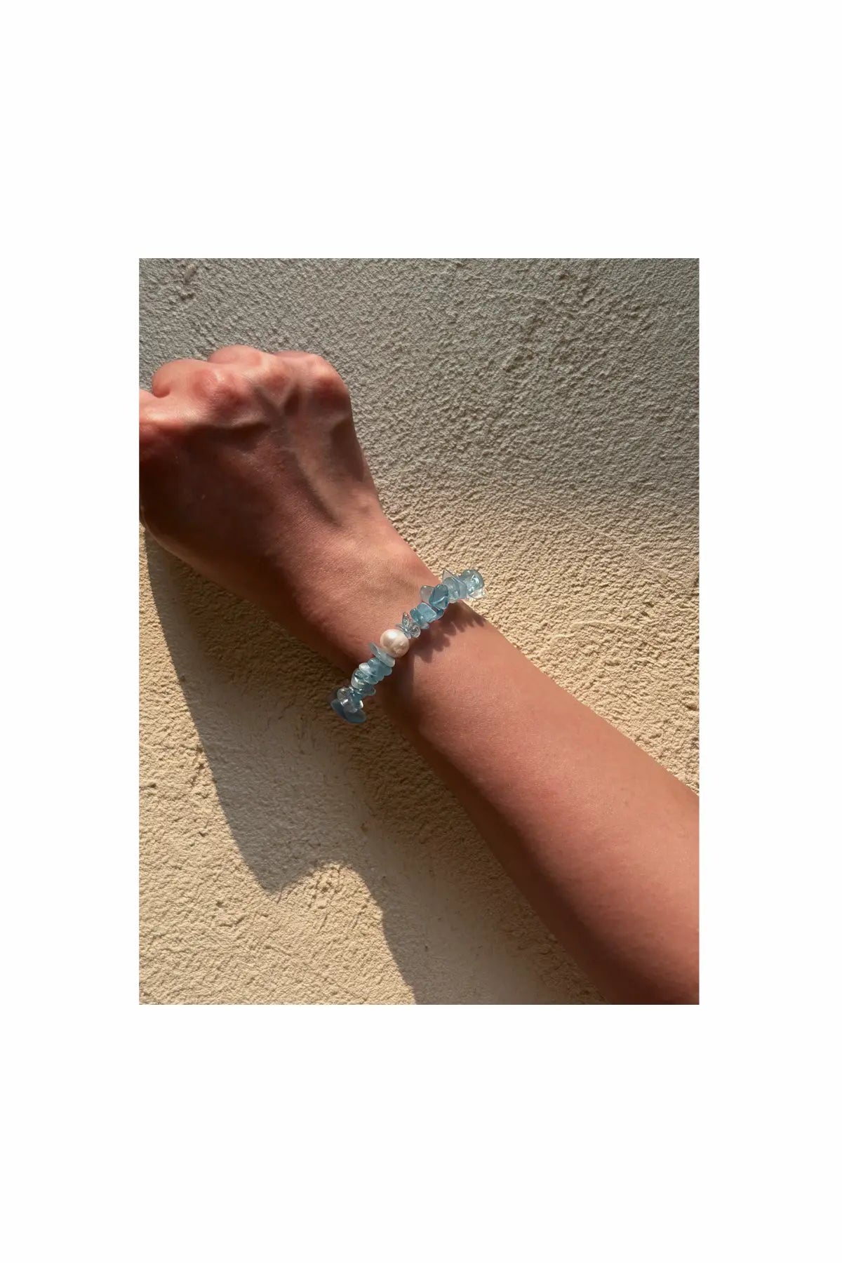 Aquamarine is known for its calming properties, helping to clear emotional tension and promote peace within. It gently soothes the mind, calming anxiety and restoring emotional balance. Clear quartz, with its amplifying energy, enhances the effects of aquamarine, purifying the aura and promoting clarity in thought and spirit. The pearl at the center of the bracelet adds elegance and wisdom, representing emotional balance, purity, and soft strength.