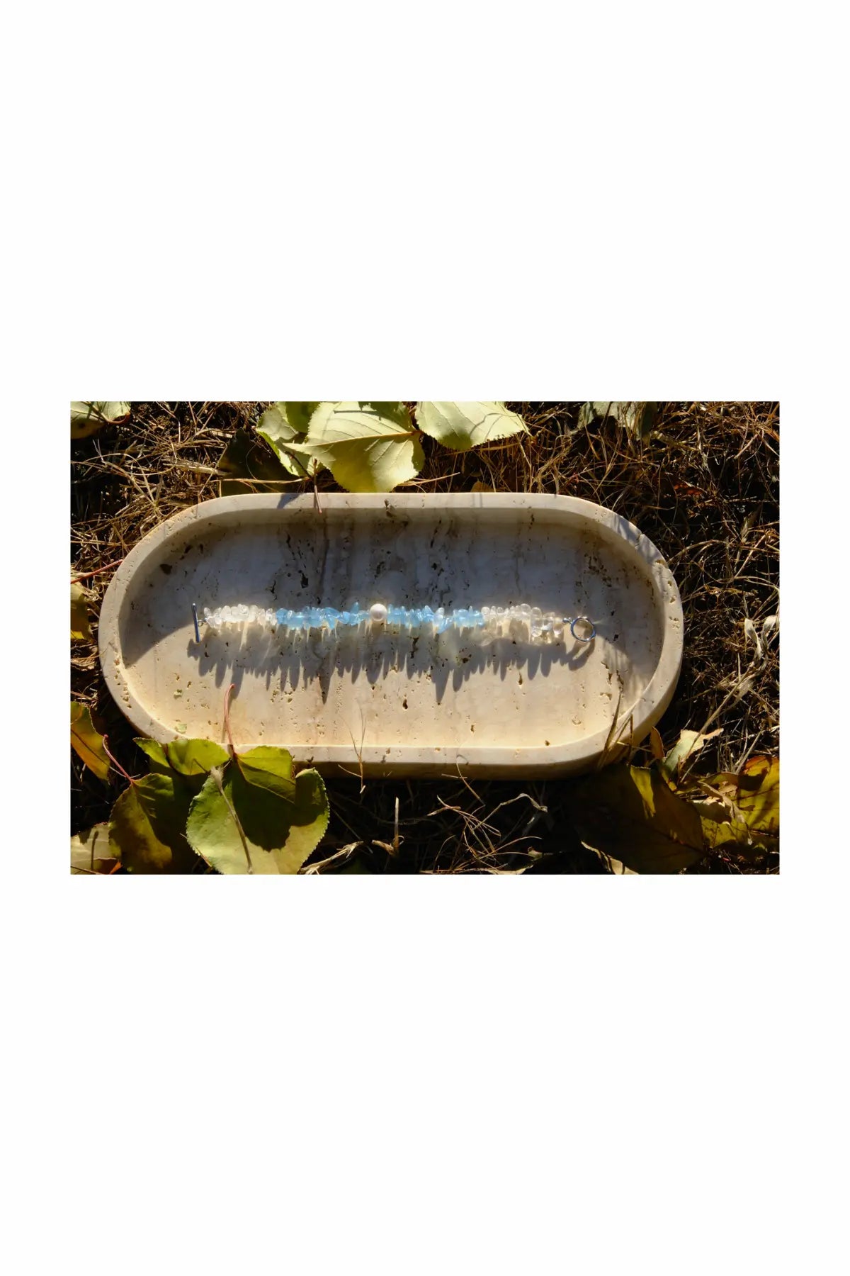 This Saae Nest bracelet combines the gentle, calming energy of aquamarine and Clear quartz crystal chips, centered around a single freshwater pearl. The bracelet is crafted from natural crystal fragments, each one unique, embodying the raw beauty of nature's energy. The texture of the crystal chips provides a grounding effect while carrying the soothing qualities of aquamarine and the purifying clarity of Clear quartz.